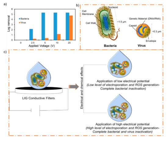 (a) Bacterial and virus inactivation at different voltages at a constant flow rate of ~1000 L m−2 h−1; (b) Comparison of the major structural components of the virion and bacteria that might be affected by the electrically active filters; (c) Proposed mechanism for microbial and viral inactivation.