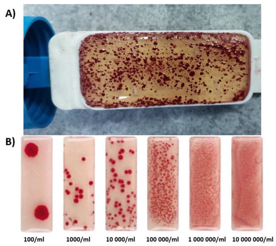 Active sludge samples were collected from the sewage treatment plant “Pomorzany” from the aeration chamber; later aerated, and stored until use. The concentration of active sludge suspensions was subjected to a microbiological test used for the designation of the total number of microorganisms (Schulke Mikrocount Duo, Norderstedt, Germany). A microbiological test with medium and TTC agar was immersed for 10 s in an active sludge. The test was secured at room temperature for four days, after which the number of bacteria was evaluated (by evaluating the appearance of the test against the appearance of a benchmark test)—Figure 2.