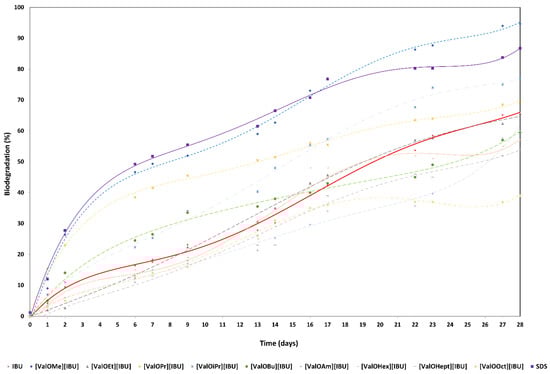 The maximum level of biodegradation after 28 days was 65.4% ± 3.1 of ibuprofen. The highest degree of biodegradability (94.7% ± 2.3) was assigned to [ValOMe][IBU], and slightly lower degrees of biodegradation (86.8% ± 8.5) were characterized by the reference compound—sodium dodecyl sulfate (SDS). Furthermore, five modified compounds [ValOEt][IBU], [ValOPr][IBU], [ValOiPr][IBU], [ValOBu][IBU], and [ValOAm][IBU] were characterized readily by biodegradabilities of 65.7% ± 0.6, 69.5% ± 10.6, 77.0% ± 1.0, 59.5% ± 9.8, and 59.7% ± 10.6, respectively. While extending the side alkyl chain, poorly biodegradation susceptibility of tested compounds was observed: [ValOHex][IBU] (57.0% ± 3.4), [ValOHept][IBU] (54.0% ± 1.5), and [ValOOct][IBU] (39.0% ± 5.4) after 28 days of the experiment (Figure 4, Tables S1 and S2).