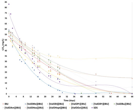 At 29–68 days, the degradation rate of [ValOBu][IBU], [ValOAm][IBU], [ValOHex][IBU], [ValOHept][IBU] and [ValOOct][IBU] by active sludge decreased (amounted to ≤1%/day). In the case of IBU, [ValOMe][IBU], [ValOEt][IBU], [ValOPr][IBU], and [ValOiPr][IBU], the degradation rate by active sludge amounted to ≥1%/day.