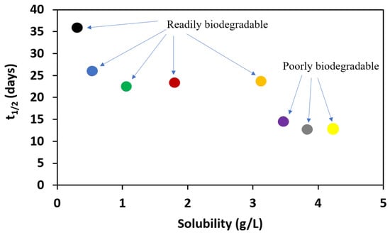 It can be further noted that half-lives for these compounds depend on the solubility of these compounds. In biodegradation studies, poor solubility may result in low bioavailability and thus lower biodegradation rates, as shown in Figure 6.