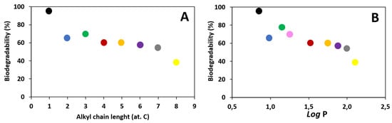 It has been shown that the length of the alkyl chain in the cationic part of the ionic liquid (in the alkyl ester of L-valine) affects biodegradability. A significant decrease in biodegradability was noticed with an increase in the length of the carbon chain, as shown in Figure 8A. Moreover, a relationship was observed between the lipophilicity of the analyzed compounds, expressed as the partition coefficient (log P) and biodegradability (Figure 8B). The obtained results indicate that the less lipophilic the compound, the higher the biodegradation. The reason for this phenomenon is probably the higher toxicity against bacteria from activated sludge of these compounds [40,41].