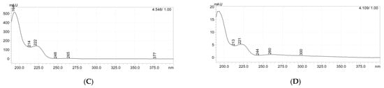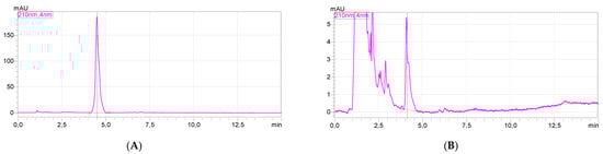 HPLC analysis of the solutions in the test vessel after 28 days of biodegradation showed that the test compound could still be detected in the test vessel after the test time. For confirmation, the chromatogram and the UV–Vis spectrum of the test compound are shown (Figure 8, at left). The right side of Figure 6 shows the chromatogram and the UV–Vis spectrum for the signal with a retention time of 4.109 min; the remaining peaks visible in this chromatogram come from the test mixture and are also detected in the blank. As can be seen, the obtained UV–Vis spectra are identical, therefore the analyzed compound was [ValOAm][IBU]. A similar situation was observed for the remaining compounds.