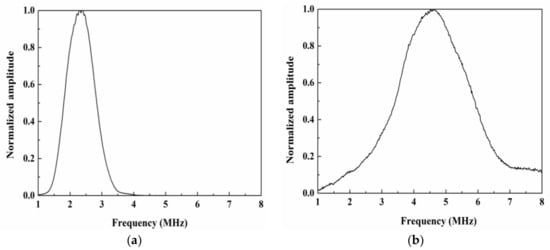 A frequency-sweep analysis of the transducer is conducted to obtain its frequency response and select the appropriate excitation frequency. Frequency-sweep tests are carried out with superheterodyne technology and the phase-sensitive detector of a RAM-5000 SNAP system (RITEC Inc., Warwick, RI, USA), with the nonlinear Lamb wave signal chosen as the integral window. In this experiment, two ultrasonic transducers, one with a central frequency of 2.25 MHz (Olympus NDT Panametrics, A542S, Olympus, WA, USA) and the other with a central frequency of 5 MHz (Olympus NDT Panametrics, V543, Olympus, WA, USA), are applied as excitation and receiving transducers, respectively. Figure 1 shows the frequency response range of these two transducers. The excitation transducer is a narrowband longitudinal ultrasonic transducer, and the receiver is a broadband longitudinal ultrasonic transducer.