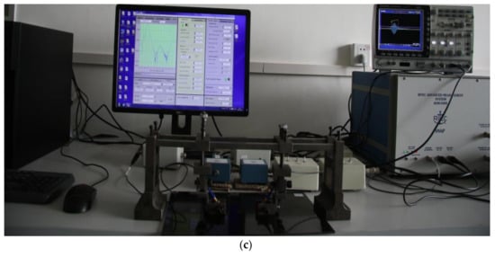 A RAM-5000 SNAP nonlinear ultrasonic detection system is employed to generate high-power tone burst signals [32], and the frequency, cycle number, output level and gain of the signals can be conveniently and flexibly set through a computer-controlled panel, as shown in Figure 2a. A block diagram of the setup is shown in Figure 2b. Its key component, the RAM-5000 SNAP detection system, emits sequences of tone burst cycles attenuated by 4 dB. After the 2.25 MHz low-frequency filter group removes any high-frequency interference generated by the device, the transducer with a center frequency of 2.25 MHz generates ultrasonic Lamb waves that enter the samples. The broadband transducer (5 MHz) is employed to receive the propagated signal via the fundamental wave channel (CH1) and second harmonic channel (CH2). After 4.5 MHz high-pass filtering and 20 dB preamplification, the signal is received at CH2, after which it enters the RAM-5000 SNAP system for signal extraction and processing. A photograph of the experimental test system is shown in Figure 2c.
