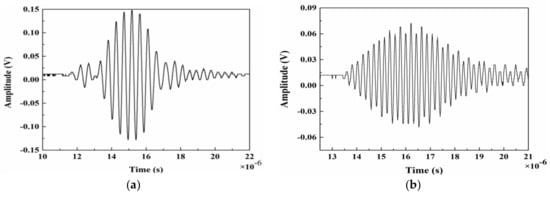 Lamb wave time-domain signal recorded by the oscilloscope: (a) Fundamental wave and (b) second harmonic.