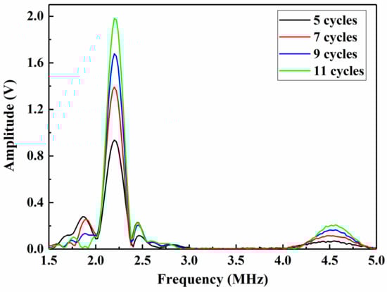 At an excitation frequency of 2.25 MHz and a cycle number of 9, the time-domain signals of Lamb waves are recorded with the oscilloscope, as shown in Figure 3. The frequency-domain signal during the various cycles is shown in Figure 4. Then, A1 and A2 are extracted, and with an increasing number of cycles, the amplitude continues to increase, and the signal is significantly enhanced.