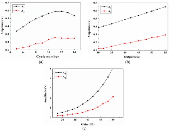 Before the RSM analysis, the factors and levels of the experiment should be selected according to the range of the individual factors. Under the same conditions, only one independent variable is adjusted, and its effect on the nonlinear amplitude is determined, as shown in Figure 5. If the number of cycles is small, then the launch energy is low, which makes it difficult to obtain harmonics at the receiving end. If the number of cycles is large, the wave of the first cycle propagates through the sample and is reflected, thereby interfering with the newly excited wave. Therefore, the measurements could be inaccurate. The effect of the cycle number on the amplitude is shown in Figure 5a. With an increasing number of cycles, the values of A1 and A2 also exhibit a rapid increase to reach maximum values at 11 cycles followed by a decrease. A1 and A2 mainly increase because of the increase in number of cycles and launch energy. However, since the test sample is thinner, nonlinearity of the pulse strings occurs due to overlap, and the trailing effect of the received signal should be minimized. The data fluctuate within the range from 7 to 11 pulse strings, which corresponds to a relatively small cycle number and a relatively stable measurement environment. Figure 5b,c shows that both the output level and gain indicate amplification of the received signal. With an increasing signal, the amplitude value continuously increases. However, an excessive signal leads to an excessive voltage, which could damage the device, and the signal could become too large to receive the excessive amplitude value, which easily leads to distortion. Thus, to guarantee the signal stability, the step size of the output level and gain should be gradually increased.