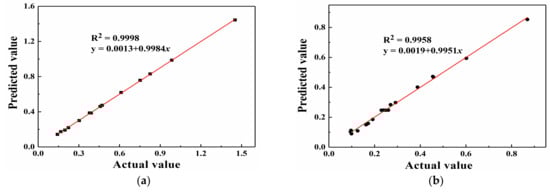 To further verify that the RSM model satisfies the requirements of the amplitude, we randomly selected ten training points outside the response surface level and substituted them into Equations (12) and (13) to compare the accuracy of the predicted values and experimental data. The calculation results for the corresponding nonlinear coefficient β′ are listed in Table 5, and the relative errors in the response values A1, A2, and β′ are below 10%. The experimentally measured values match the predicted values from the regression model, which indicates that the response surface model fits the actual situation accurately and that the RSM application to the experimental parameters of the nonlinear ultrasonic amplitude is optimized. The established quadratic nonlinear regression model is accurate and effective, and the experimental fitting effect is suitable, which yields a certain practical value.