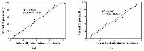 The internally studentized residuals are the values obtained by dividing the residuals by their standard deviations, which are considered to intuitively assess whether the assumption that the error terms obey a normal distribution is true. If the assumption holds true, then the distribution of the internally studentized residuals should also obey a normal distribution. The internally studentized residuals are the statistics of the abnormal point test. Figure 7, Figure 8 and Figure 9 show a comparison of the predicted and actual values, the residual normal probability distribution, and the internal residual and predicted value distributions. The comparison of the experimental and predicted values reveals that a high degree of similarity exists between the actual and predicted values. Furthermore, the normal probability distribution of the residuals exhibits near-linearity, and irregular distributions of the internally studentized residuals and predicted values are obtained. Based on Figure 7, Figure 8 and Figure 9, the response surface models of A1 and A2 attain good adaptability in nonlinear ultrasonic nondestructive detection.