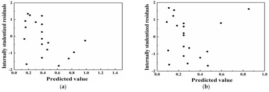 Distribution of the predicted values and internally studentized residuals: (a) A1 and (b) A2.