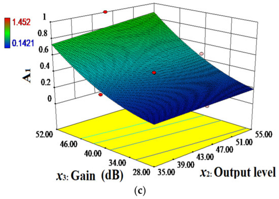 Three-dimensional (3D) response plots: (a) Cycle number (x1) and output level (x2), (b) cycle number (x1) and gain (x3), (c) output level (x2) and gain (x3), and their mutual interactions with A1.