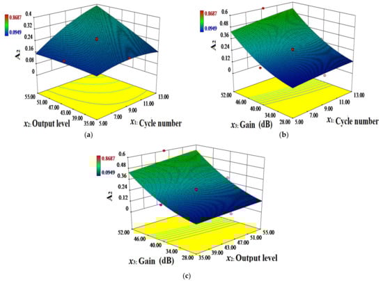 Three-dimensional (3D) response plots: (a) Cycle number (x1) and output level (x2), (b) cycle number (x1) and gain (x3), (c) output level (x2) and gain (x3), and their mutual interactions with A2.