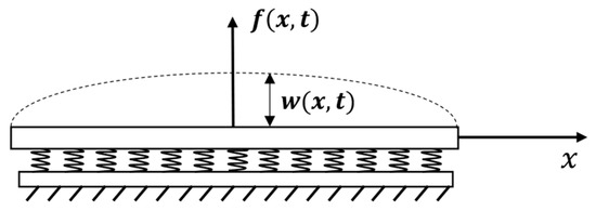 Similar analysis is performed to model the adhesion zone based on beam approximation, which takes into account the bending rigidity of the structure. This model is based on a Euler–Bernoulli beam on an elastic foundation under dynamic loading. The axis is directed along the axis of the beam, the axis is normal to the adhesive zone, and is vertical deflection of the beam along at point and at time . A schematic diagram of beam and coordinate system are shown in Figure 2. Tensile forces can be ignored because their influence on the system is significantly less than that of bending forces. In this case, the adhesion zone is described by a fourth-order partial differential equation [9]: