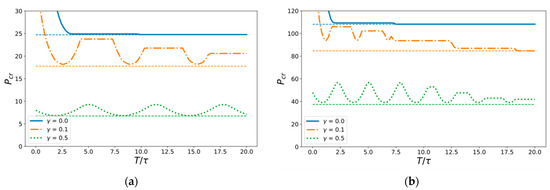 Figure 4 shows the dependence of the critical amplitude on its duration at a certain frequency of the background field for the cases of the pulse load of the beam or the membrane. These plots demonstrate the decrease in the threshold amplitude with the growth of the load pulse duration, and it is almost independent of duration greater than . This phenomenon is typical for transition to the static branch of the temporal dependencies of strength in various problems of dynamic fracture [28,29,30].