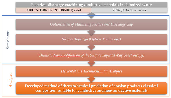 The tasks of the study are the research of the surface topology of two structural materials, namely austenite anticorrosion X10CrNiTi18-10 (12kH18N10T) steel (nickel-contacting) and 2024 (D16) duralumin (non-nickel-containing), after electrical discharge machining with a brass wire tool electrode in a deionized water medium and the thermochemical analysis of chemical reactions between electrodes and working fluid (Figure 1).