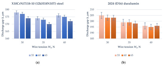 The measured difference in the discharge gaps between two structural materials is related to their electrical properties. As can be seen from Table 5, they have values of specific electrical resistance differing by a factor of ~14 (0.725 for steel and 0.052 for duralumin), which explains the difference in the discharge gap. Since duralumin is more conductive (electrical conductivity is the reciprocal of electrical resistance), the breakdown of the dielectric medium (deionized water) occurs at a greater distance than for stainless steel. According to generally accepted information about the typically recommended spark gaps for materials and electrical resistivity values, the lowest value of the conductive materials is listed for graphite, which also exhibits electrical anisotropy [56], and the highest values for listed for silver [57], metallic carbides (delocalized metal bond d-element carbides such as FexCy, WC, TiC, VxCy, CrxCy, and NixC) [58,59], nitrides [60,61,62], and superconducting intermetallics [63]. The lowest values of the discharge gap correspond to the stable wire electrical discharge machining mode that allows more effective control of part geometry.