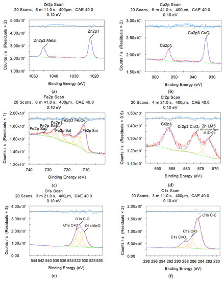 X-ray photoelectron spectroscopy of machined surfaces of X10CrNiTi18-10 (12kH18N10T) steel workpiece in water medium: (a) zinc; (b) copper; (c) iron; (d) chromium; (e) oxygen; (f) carbon.