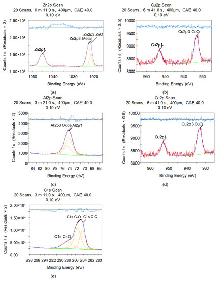 X-ray photoelectron spectroscopy of machined surfaces of 2024 (D16) duralumin workpiece in water medium: (a) zinc; (b) copper; (c) aluminum; (d) oxygen; (e) carbon.