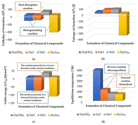 Thermochemical parameters of chemical reactions of nickel and zinc in a water medium: (a) enthalpy of formation; (b) entropy of formation; (c) Gibbs energy; (d) equilibrium temperatures.