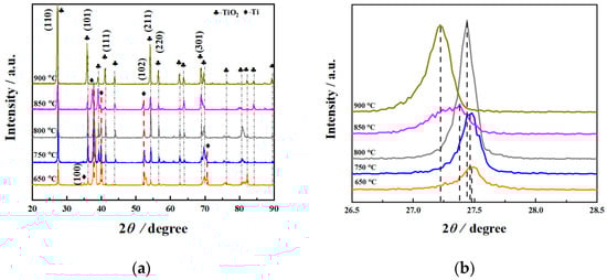 X-ray diffraction was performed on the treated specimens at different processing temperatures, and the specific pattern is shown in Figure 1. From the XRD results (Figure 1b), it can be seen that as the processing temperature increased, the intensity of the oxide layer on the surface of the specimen increased first and then decreased. Moreover, the intensity of the diffraction peak of the matrix phase gradually decreased. In addition, the diffraction peak intensity of TiO2 in the (110) plane basically gradually increased with the increasing processing temperature, indicating that the growth direction is [110]. As shown in Figure 1a, it was revealed that TiO2 was formed on the surface. Additionally, the diffraction peak of Ti was detected at 650 °C, indicating that the oxide layer was relatively thin at this processing temperature, and the influence of the matrix peak was present. It was inferred that oxygen diffused at high temperatures and became more obvious with different processing temperatures. As is well known, under the same test conditions, the X-ray inspection depth is constant. As the thickness of the oxide layer increased, the detection of the Ti matrix peak became more difficult, resulting in a decrease in the intensity of the Ti matrix peak. It can be seen from Figure 1a that when the processing temperature was 900 °C, the Ti matrix peak was almost invisible, which may be due to the thick oxide layer at this processing temperature. The results are shown later in the present research report.