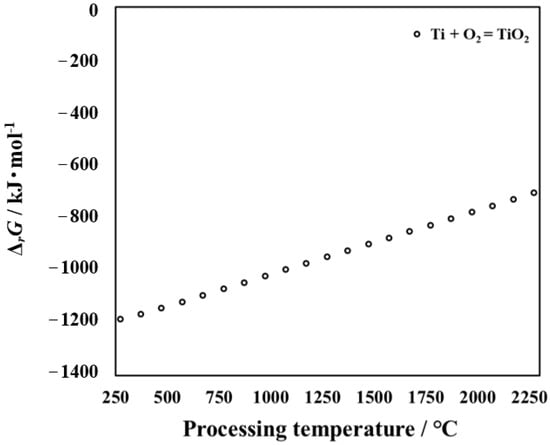The influence of processing temperature on the ΔrG of reactions (1) is shown in Figure 2. When the value of ΔrG is less than zero, the reaction can occur. Moreover, the smaller the value of ΔrG, the more easily the reaction proceeds []. From Figure 2, it can be seen that O and Ti can react to form oxide. As shown in Figure 2, the higher the temperature, the higher the Gibbs free energy of TiO2 required, and the more difficult it is to generate. However, it is well known that the higher the temperature, the more active the random diffusion motion of atoms in metallic material. As a result, as the processing temperature increases, more oxygen atoms diffuse into the interior. In order to further analyze the product, its thermodynamic parameters need to be calculated. Thermodynamic calculations were carried out for the untreated titanium that may be generated during the processing in this research. Oxidation is a process in which oxygen atoms diffuse from the outside to the inside and react with titanium. With an increase in the processing time, the content of oxygen atoms on the surface and inside of the specimen is different. Conclusions can also be made from cross-sectional observation. At this time, Ti + O2 = TiO2 reaction occurs, and TiO2 is formed on the outermost surface. The results suggest that a large amount of TiO2 can be detected by XRD at high processing temperatures. The results of Gibbs free energy are consistent with those of the XRD results.