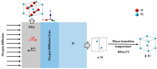 Figure 3 shows a schematic diagram of the oxide layer structure on the surface of a pure titanium sample. The unit cells in the figure are all made with the ionic radius of the substance. The red balls represent oxygen atoms, and the light blue balls represent titanium atoms. In addition, O has an ionic radius of 140 × 10−12 m, and Ti has an ionic radius of 68 × 10−12 m. It can be seen that the size of oxygen is larger than that of titanium in the unit cell of TiO2. During the oxidation process, oxygen atoms and titanium atoms form a rutile TiO2 oxide layer on the outermost layer of the sample. The space group structure is P42/mmm at room temperature. The crystallographic constants are a = 0.465 nm, b = 0.465 nm, and c = 0.297 nm [,]. With the extension of the oxidation time, oxygen ions diffuse through the TiO2 layer into the specimen, forming an oxygen diffusion zone between the Ti matrix and the TiO2 oxide layer [,]. Under high temperature conditions, the pure Ti matrix undergoes a configuration transformation from α-Ti to β-Ti, and 884 ± 2 °C is the phase transition temperature of the two structures. The schematic diagram of the lattice transformation of the transformation process is also presented in Figure 3. The space group structure of α-Ti is P63/mm, and the crystallographic constants are a = 0.293 nm, b = 0.293 nm, and c = 0.466 nm []. The space group of β-Ti after high-temperature phase transition is Im3-m, and the crystallographic constants are a = 0.282 nm, b = 0.282 nm, and c = 0.282 nm []. A uniform and continuous TiO2 oxide layer is formed on the surface of the pure Ti specimen, which can significantly reform the surface hardness and the wear resistance of the pure Ti specimen.