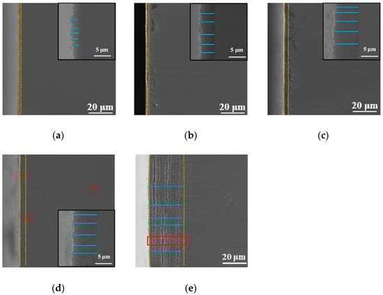 The SEM cross-sectional morphology observation method was used to study the effect of the processing temperature on the cross-sectional morphology of the specimen, and the results are shown in Figure 4. In addition, the results of point elemental distribution (the positions marked 1, 2, and 3 in Figure 4d) are also shown in Table 1. As is well known, EDX can only be qualitatively analyzed; it cannot be quantitatively analyzed, but it can be roughly seen from Table 1 that the oxygen content gradually decreased from the outermost layer to the Ti substrate. As shown in Figure 4, the thickness and morphology of the oxidation layer varied with different processing temperatures, as observed in the vicinity of the surface. Comparing with XRD results, in each processing temperature, there was an oxide peak that differed from the Ti substrate peak. In addition, it can be seen from Figure 4 that the thickness of the oxidation layer on the surface increased as the processing temperature increased (the interval of the yellow dashed line indicates the thickness of the oxide layer at each processing temperature). Aniołek et al. [] discussed cyclic oxidation of titanium grade 2. It was found that the processing formed an oxygen layer on the surface. In addition, it was found that the oxide layer was composed of TiO2. It has a different appearance from that of Ti substrate under SEM observation. This is consistent with the phenomenon observed in this study. The thickness of the cross-section oxide film in Figure 4a–e was measured by multiple lines (the blue lines are the measurement lines), and the results were 2.18 μm, 4.21 μm, 5.41 μm, 7.22 μm, and 28.18 μm, respectively. These results suggest that the thickness of this diffusion-layered structure tended to increase with increasing processing temperature. This shows that at each processing temperature, the oxide formed on the surface of the specimen. Notably, when the processing temperature increased to 900 °C, the thickness of the diffusion layer reached the maximum value. However, at this processing temperature, delamination could be clearly observed, indicating that the oxide layer was less dense. This can lead to obtaining poor mechanical properties at this processing temperature, and a specific explanation is provided later in the present research. In order to further discuss the causes of this phenomenon, we performed magnification (red rectangle position) on Figure 4e, and the results are shown later in the present research report (see Figure 5).