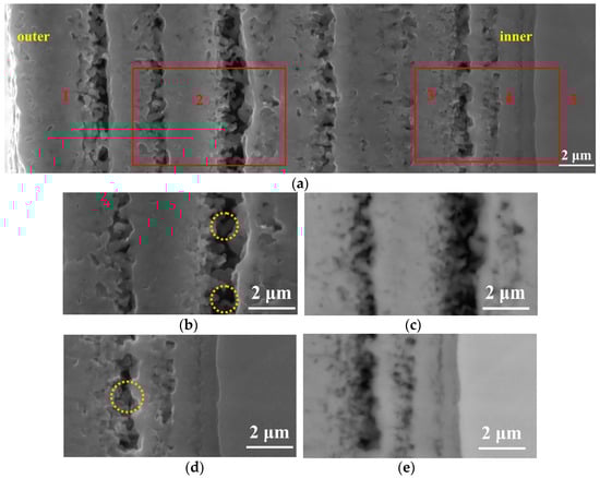 Cross-sectional observation at different locations at 900 °C. (a,b,d) are the morphologies observed in the SE image, and (c,e) are the morphologies observed in the BSE image.