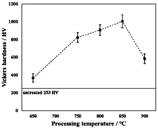 Surface hardness of untreated and treated specimens with varied processing temperatures.