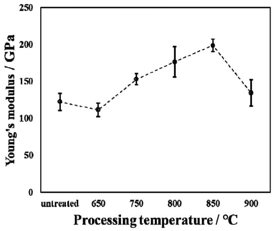 Young’s modulus of untreated and treated specimens by oxidation with varied processing temperatures.