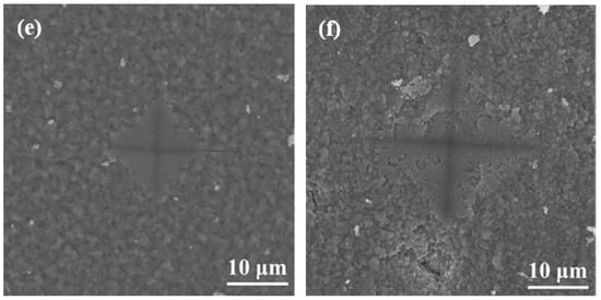 SEM micrographs of the indentation with varied processing temperatures of (a) untreated specimens and those treated at (b) 650 °C, (c) 750 °C, (d) 800 °C, (e), 850 °C and (f) 900 °C.