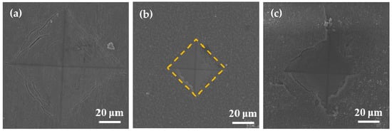 During surface hardness testing, the residual stress on the specimen surface interacts with the force applied by the indenter, which affects the actual indentation morphology. Based on the surface hardness indentation morphology, the properties of the residual compressive or tensile stress on the surface of the specimen can be qualitatively determined. The results of this test provide assistance in explaining the wear resistance of the surface hardened layer. Notably, it contributes to explaining the fatigue resistance of the surface hardened layer. Appropriate residual compressive stress on the surface is beneficial in improving wear resistance. For the same position on the specimen, the multiple reciprocating motions of wear testing are equivalent to those of fatigue testing. According to Ref. [], when measuring surface hardness, the residual stress affects the shape and size of the specimen indentation. When there is tensile stress on the specimen surface, dents appear around the dents, and when there is compressive stress, protrusions appear around the dents. Figure 8 shows the SEM micrographs of the indentation morphology of the experiment at various processing temperatures. As shown in Figure 8, it is assumed that the residual stress of the untreated specimen is approximately zero. According to the shape of the indentation, the type of stress in Figure 8 can be determined. The internal stresses in Figure 8b are approximately equal to 0, and those in Figure 8c,d are compressive stresses. It can be seen from Figure 8c,d that as the processing temperature increased, the compressive stress was also different. It can be seen from Figure 8 that under the action of compressive stress, cracks (the yellow circle position) of varying degrees appeared. In addition, when the processing temperature was increased to 900 °C, it can be seen from Figure 8 that under the same loading force, the size of the indentation was obviously greater than 850 °C, which also indicates that the surface hardness of the specimen was lower. In addition, no cracks were found at this processing temperature. This is due to the porous layered structure at this processing temperature, which alleviates the effect of stress. The indentation morphology of the treated specimens at 650 °C, 850 °C, and 900 °C was observed under a high loading force (9.8 N) in order to further analyze the morphology of the indentation. The results are shown in Figure 9. When the processing temperature was increased to 650 °C, combined with the results of Young’s modulus, it can be seen that the resistance to deformation at this processing temperature was weak (see Figure 7). It can be seen from Figure 9a that in this condition, the shape of the indentation was almost a square, indicating that the stress was very small in this condition, almost close to zero. When the processing temperature was increased to 850 °C, in order to facilitate the analysis of the indentation morphology, the four corners of the indentation were connected with a yellow dashed line. The result is shown in Figure 9b, where the indentation is curved toward the center of the yellow dashed line at this processing temperature, indicating that there was compressive stress in this condition. According to the results in Figure 7, it can be seen that Young’s modulus at this processing temperature reached its maximum value, indicating that the resistance to elastic deformation was strongest in this condition. However, no cracks can be observed in Figure 9b, indicating that the compressive stress in this condition is relatively large. Moreover, its ability to resist deformation is strong, which reduces the influence of external forces on the specimen. When the processing temperature was increased to 900 °C, it can be seen from Figure 9c that more serious cracks occurred. Because it was under the same loading force, the internal stress of the specimen was relatively large, and the specimen under this condition did not have the ability to resist elastic deformation (Young’s modulus was low), causing cracks to occur. In addition, it can be seen from Figure 4 that delamination of the hardened layer at this processing temperature occurred. Under the same loading force, compared with other conditions, it was more easily damaged, which led to the peeling of the hardened layer.