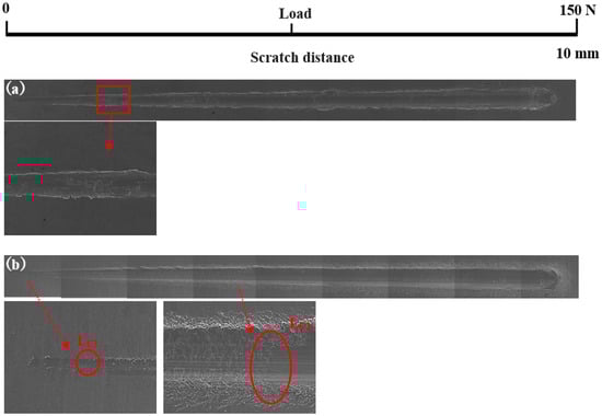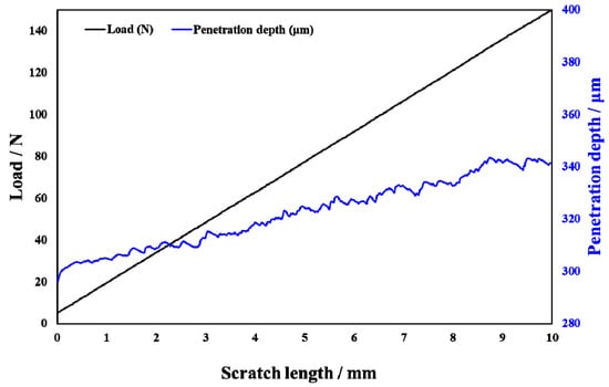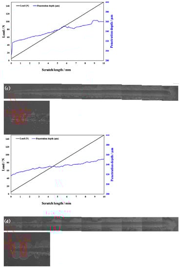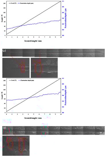 Scratch testing was performed on hardened layers to quantitatively determine their cohesion and adhesion strength. Figure 10 presents the SEM image of the scratch track and the corresponding scratch loads and distances. The curve of force and indentation depth with the scratch length are also shown in Figure 10. From this curve, it can be seen that the depth of the grooves increased with the increasing load from 0 to 150 N. The result of the scratch test for the untreated specimen is shown in Figure 10a. Comparing the results of the untreated specimen with those of the specimens treated at different processing temperatures, there were more cracks, chippings, and other defects around the scratched surface of the hardened layer, and there was also a local oxidation-hardened layer that could be peeled off, indicating that the bonding strength of the hardened layer/substrate substantially decreased. At 750 °C, 800 °C, and 900 °C, the peeling of oxidation-hardened layers was particularly noteworthy. This is because high-hardness, single-element materials undergo brittle fracture when the load is large (greater than the elastic limit of the material) []. When the processing temperature was 650 °C, due to the low surface hardness of the specimen, obvious hardened layer peeling did not easily occur under external loading, but obvious cracks appeared in the initial stage of loading. This is due to the fact that the oxidation-hardened layer was relatively soft and could not withstand a large load, causing it to lose effectiveness. Moreover, because the surface hardness of the hardened layer was relatively small, no large peeling occurred, but cracks developed outward. When the processing temperature was increased to 850 °C, the hardened layer did not peel off as the loading force reached about 60 N, and the adhesive between the hardened layer and the substrate was better at this processing temperature. With the increasing loading force, cracks that expand outward appeared in the hardened layer, and peeling gradually occurred.