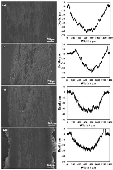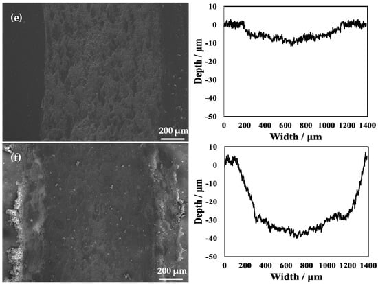 The SEM micrographs and 2D profilometric view of both untreated and treated specimens with different processing temperatures are shown in Figure 11. From the 2D profile showing the depth of wear, it can be seen that the oxidation treatment of pure titanium reformed its wear resistance. Notably, when the processing temperature was increased to 850 °C, it can be clearly seen that the width of the wear scar became narrower. However, the untreated specimen showed a wide wear track. Moreover, the average wear depth of the wear track is 58.0 μm for the untreated specimen. The rough 2D wear track is shown in Figure 11a. The untreated specimen shows a larger and deeper wear track compared to that of the treated specimens. During the wear test, the surface of the untreated specimen was severely smeared. This indicates that it had severe plastic deformation. In addition, it was found that when the processing temperature was increased to 650 °C, the wear track was deep, but it was lower than that of the untreated specimen. This is because the generated hardened layer plays a role in protecting the matrix and reduces the wear amount in wear testing. In addition, when the processing temperature was increased to 750 °C, the hardened layer was very thin. In addition, it can be seen from the results of the scratch testing that the binding strength at this processing temperature was relatively low, and particles that increase wear were generated during wear testing. When the processing temperature was increased to 850 °C, due to the better resistance to deformation of the hardened layer, no obvious deformation and smearing effects of the worn surface were observed, as shown in Figure 11. This resulted in a significant reduction in the wear depth. This is because the hardened layer plays a role in protecting the substrate. Notably, for the wear resistance of materials, due to the presence of the hardened layer, the adhesion of the soft Ti matrix and the abrasive wear resistance increased. Maytorena-Sánchez et al. [] also indicated that the amount of wear was lower at a processing temperature of 850 °C. However, when the processing temperature was increased to 900 °C, the wear of the hardened layer intensified. This is because there were a considerable amount of oxides on the surface at this processing temperature, which led to the decrease in toughness of the specimen. Consequently, the oxide layer was easily broken. In addition, since the hardened layer at this processing temperature had a porous structure, there were gaps between the layers, which were easily peeled off under the action of an external loading force. During wear testing, the oxide peeled off from the substrate and entered the space between the specimen and the grinding ball. The peeling oxide moved on the surface of the specimen under the drive of the grinding ball, resulting in abrasive wear. It can also be observed from Figure 11f that there were many abrasive particles on the surface. At this processing temperature, due to a thick oxide layer, the wear of the specimen was the most serious at the selected processing temperatures, and the wear amount reached its maximum value.