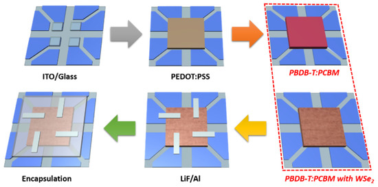 The indium tin oxide (ITO)-patterned glass substrates were cleaned sequentially with acetone, methanol, and isopropyl alcohol for 5 min by sonication treatment, then dried in a vacuum oven at 100 °C, before finally being exposed to UVO treatment for 15 min. The PEDOT:PSS was spin-coated onto the cleaned ITO substrate at 3000 rpm for 30 s and then annealed at 150 °C for 30 min, resulting in a 40 nm thick PEDOT:PSS. For the pure active layer formation, a mixture of PBDB-T and PCBM (with a weight ratio of 2:3) was completely dissolved in chlorobenzene with a concentration of 20 mg/mL, then subjected to constant stirring for 3 h at 60 °C. Next, the prepared solution was spin-coated onto the PEDOT:PSS layer at 1100 rpm for 30 s, and treated by thermal annealing at 150 °C for 10 min. To prepare the WSe2 NSs blended active layer, the selective concentration (1, 1.5, and 2 wt%) of prepared WSe2 NSs (NS1–NS3) was dissolved in isopropyl alcohol and then mixed with the chlorobenzene mixture (PBDB-T:PCBM—2:3 ratio), before being subjected to constant stirring for 3 h at 60 °C. The WSe2 NSs blended PBDB-T:PCBM active layer was then spin-coated onto the PEDOT:PSS layer at 1100 rpm for 30 s, and treated by thermal annealing at 150 °C for 10 min (Table S2). Finally, a 5 nm lithium fluoride (LiF) layer and a 120 nm Al cathode were deposited on top of the active layer by thermal evaporation under a pressurized environment of 3 × 10−7 torr. The fabricated device contains four cell structures with an active area of 0.04 cm2. To prevent the exposure of the fabricated detector to oxygen and humidity, it was enclosed under a glass lid in a glove box. The device fabrication scheme of a patterned ITO substrate with different active layers (PBDB-T:PCBM (92 nm) and PBDB-T:PCBM:WSe2 (89 nm)) is shown in Figure 1.