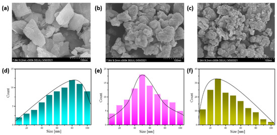 SEM images of WSe2 NSs (a) NS1 (6 h sonication), (b) NS2 (12 h sonication), and (c) NS3 (18 h sonication); (d–f) particle size distribution of WSe2 NSs (d) NS1 (6 h sonication), (e) NS2 (12 h sonication) and (f) NS3 (18 h sonication).
