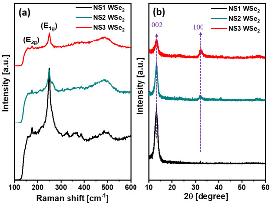(a) Raman spectra and (b) XRD patterns of NS1–NS3 WSe2 NSs.