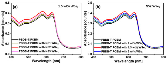 The effect of incorporation of different WSe2 NSs with the PBDB-T:PCBM active layer on the optical properties was investigated by ultraviolet–visible absorption spectroscopy. Figure 4a shows the absorption spectra of pure and NS1–NS3 WSe2 NSs blended PBDB-T:PCBM film. The pristine PBDB-T:PCBM film’s absorption spectrum displays several characteristic features with the three distinct peaks at 474, 580 and 632 nm. An observed weak peak centered at 474 nm is associated with the absorption following the extended conjugation of PCBM in the solid state, and the doublets at 580 and 632 nm attribute to the interchain vibrational absorption of ordered PBDB-T chains. Compared to the pristine PBDB-T:PCBM, the PBDB-T:PCBM:WSe2 hybrid displays an enhancement in the absorption profile for different NS1–NS3 WSe2 (1.5 wt%), as shown in Figure 4a. Furthermore, the different concentrations, such as 1, 1.5 and 2 wt%, of NS2 WSe2 NSs blended PBDB-T:PCBM films’ absorption profiles are shown in Figure 4b, which depicts a high absorption behavior for the 1.5 wt% NS2 WSe2. The addition of WSe2 NSs with the PBDB-T:PCBM active layer provides a superior photon transmission path and enhances photon absorption characteristics.