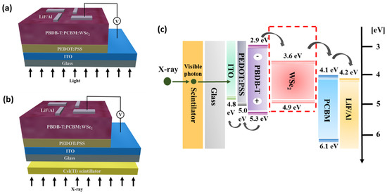 The impact of the incorporation of WSe2 NSs with an active layer on the photovoltaic and photodetector performances of ITO/PEDOT:PSS/PBDB-T:PCBM:WSe2/LiF/Al device was measured by current density–voltage (J–V) characteristics. The schematic of the hybrid polymer solar cell’s structure and the X-ray detector’s structure is shown in Figure 5a,b, respectively. Figure 5c shows the energy level diagram of each component used for the fabrication of the device. For the X-ray detector, the CsI(Tl) scintillator was constructed, which consisted of 400 μm thick CsI and 0.5 mm thick Al. The induced X-ray photons were converted through the scintillator, and were then absorbed by the active layer (PBDB-T:PCBM:WSe2 NSs) to create electron–hole pairs. The transfer of electrons/holes through the cathode/anode thus collected charges. According to the energy band position, additive WSe2 NSs help the movement of electrons from PCBM to the cathode, whereas the hole transport layer (HTL) of PEDOT:PSS helps the movement of holes towards the anode.