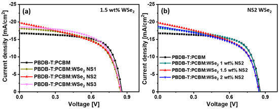 J–V characteristics: (a) pristine and different WSe2 NSs blended PBDB-T:PCBM active layers; (b) pristine and different amounts of NS2 WSe2 NSs blended into the PBDB-T:PCBM active layer.