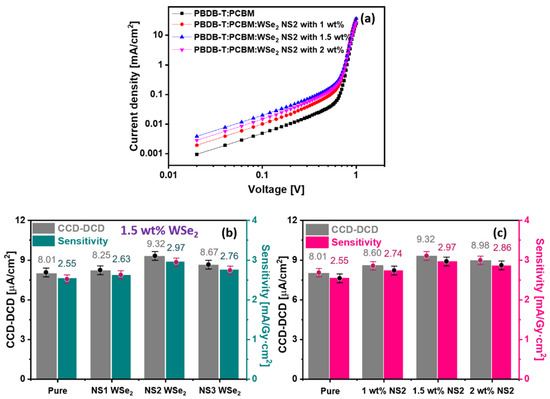 The fabricated X-ray detectors were measured using the X-ray generator and electrometer, as described in the experimental part. Figure 7a shows the logarithmic J–V characteristics of pure and NS1–NS3 WSe2 NSs (1.5 wt%) blended PBDB-T:PCBM active layers using prepared detectors. For the pristine PBDB-T:PCBM active layer, the X-ray detector achieves a 2.55 mA/Gy·cm2 sensitivity. When the active layer is blended with NS1–NS3 WSe2 NSs, the sensitivity is increased to 2.63, 2.97, and 2.76 mA/Gy·cm2 for NS1, NS2 and NS3, respectively (Figure 7b, right-side axis). The extracted CCD-DCDs (Figure 7b, left side axis) are at 8.01, 8.25, 9.32, and 8.67 μA/cm2 for the pure and NS1–NS3 blended PBDB-T:PCBM active layers using the prepared X-ray detectors, respectively. Similarly, the outcomes of different NS2 WSe2 NSs blended PBDB-T:PCBM active layers using prepared X-ray detectors are provided in Figure 7c. The sensitivity as assessed by X-ray realizes gives values of 2.55, 2.74, 2.97, and 2.86 mA/Gy·cm2 for the pristine PBDB-T:PCBM active layer and 1 wt%, 1.5 wt% and 2 wt% NS2 WSe2 NSs, respectively (as shown in Figure 7c, right-side axis). The estimated CCD-DCD values are 8.01, 8.60, 9.32, and 8.98 μA/cm2 for the pristine PBDB-T:PCBM active layer and 1 wt%, 1.5 wt% and 2 wt% NS2 WSe2 NSs, respectively. The observed X-ray detector outcomes for NS1 and NS3 WSe2 NSs (1, 1.5, and 2 wt%) blended PBDB-T:PCBM active layers are provided in Figures S3 and S4, respectively. Better outcomes are ensured for the 1.5 wt% NS2 WSe2 NSs hybrid active layer under X-ray detection due to the enhanced conductivity, improved light absorption capacity, and superior mobility.