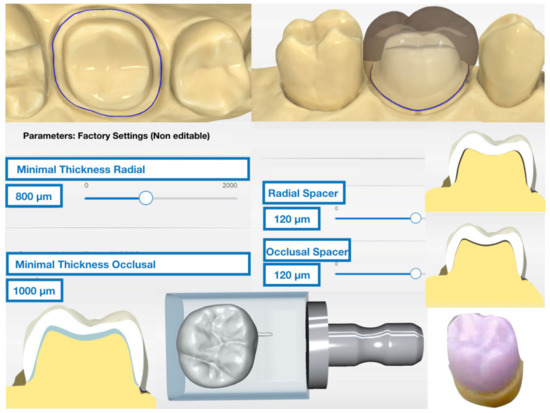 A model of an upper molar prepared for full crown with a chamfer finish line was scanned using a high-power structured light scanner (PrimeScan™, Dentsply-Sirona™, Bensheim, Germany). After the model was digitized, a 1.25-mm thick full volume restoration was designed with integrated design software (CEREC SW 5.1, Dentsply-Sirona™, Bensheim, Germany). The parameters “minimal thickness (radial)” and “minimal thickness (occlusal)” were adjusted to 1000 μm. Other than that, the standard design parameters recommended by the manufacturer were used for the crown (Figure 1). Twenty monolithic CAD/CAM restorations made of lithium disilicate-reinforced feldspathic ceramic (EMAX-CAD™ LT, A2, LOT Z016FG, Ivoclar-Vivadent™; Schaan, Liechtenstein) per study group were milled using an integrated milling machine (CEREC InLab MCXL™ system, York, PA, USA).