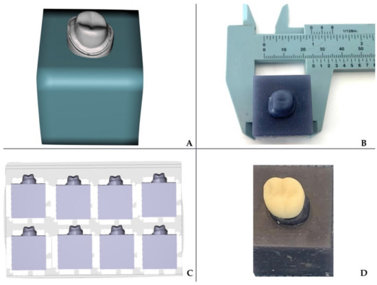 Digital file of the abutment exported from the scanned model. (A) Digital design of the block to adapt the abutment to the universal testing machine. (B,C) A cube of 25 mm3 was printed with the 3D printer for each crown. (D) Final restoration seated to the resin-printed die, previous to the loading test.