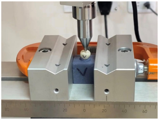 Loading of the specimen seated over the printed resin abutment using a universal testing machine.
