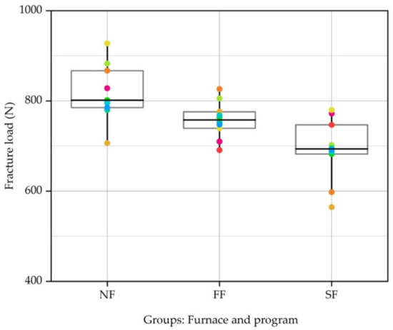 The one-way ANOVA test revealed significant differences between the groups (p < 0.05), without specifying which of these three groups presented differences between them (p < 0.001, F = 8.699) (Table 2). After that, the Bonferroni post hoc test, showed that, in particular, the SF group exhibited statistically lower fracture resistance than the NF group (p < 0.001) and the FF group (p = 0.025) (Table 3). However, a statistically significant difference was not found between the NF and FF groups (p = 0.537) (Figure 4).