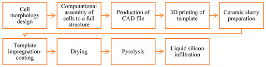 For the manufacturing of ceramic periodic structures, the lattice geometry was designed, dimensioned and printed through additive manufacturing in polymeric material. The printed polymeric structures served as templates for the ceramic coating process. The templates were impregnated with a SiC-based ceramic slurry, excess slurry was removed and the operation was repeated until sufficient thickness is built. The coated template structure (green body) was then dried, pyrolyzed in inert atmosphere up to 1000 °C and liquid silicon infiltrated at 1500 °C, delivering the final SiSiC periodic cellular structure. Figure 2 shows the main production steps employed. Table 2 shows the pros and cons of the replica method used to fabricate the SiSiC lattices.