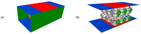 Example of computational domain: picture (a) shows the box surrounding the lattice. Picture (b) shows the same box without the lateral boundaries. The different boundary conditions are represented with different colours: blue patches are adiabatic no-slip walls. Green patches are cyclic and red patched are fixed temperature no-slip walls. Depending on the setup, the lattice surface (in grey) can be a fixed temperature wall or the interface between the fluid region and the solid one. The inlet and outlet patches are missing in both images for clarity.