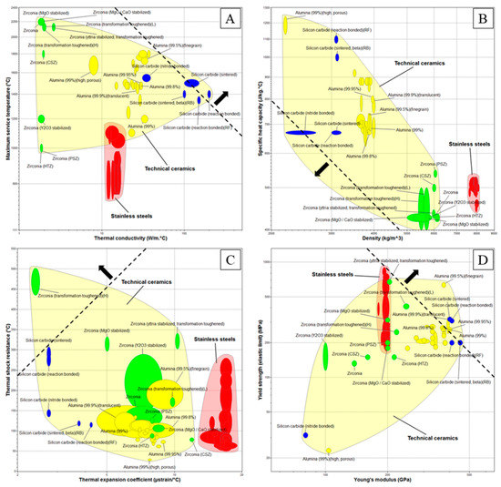 Ashby materials property chart for technical ceramics and stainless steels at 25 °C: (A) thermal conductivity against maximum service temperature; (B) density against specific heat capacity; (C) thermal expansion coefficient against thermal shock resistance; (D) Young’s modulus against yield strength. Areas’ legend: Silicon Carbide—blue; Zirconia—green; Alumina—yellow; Stainless steel—red. Materials properties were obtained from Ansys GRANTA EduPack software, ANSYS, Inc., Cambridge, UK, 2021 (www.ansys.com/materials, accessed on 30 April 2021).
