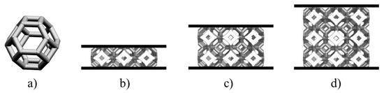 Kelvin cells (Figure 5a) were used to generate the lattices under investigation. This cell provides the best compromise between effective thermal conductivity, heat transfer coefficient, specific surface area, dispersion coefficient and pressure loss, compared to other cell geometries [44,45,46,47,48]. The Kelvin cell consists of 14 faces (6 squares and 8 hexagons), 24 vertices and 36 equal length struts. Cells were designed using a struts diameter equal to 1.10 mm and a struts length of 2.25 mm, which corresponds to a cell size of 6.35 mm (=Lref). These values were chosen as they represent the smallest dimensions which can be manufactured without major defects with the employed manufacturing technique and, at the same time, because small dimensions allow to achieve high specific surfaces (see below).